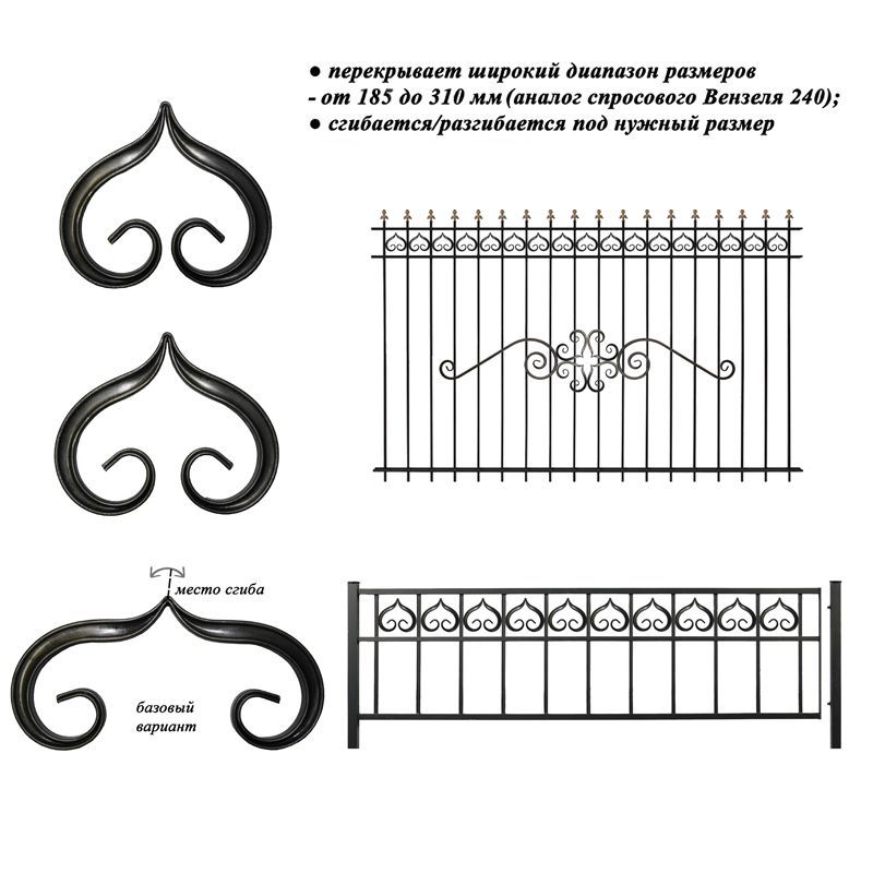 Всё это — декоративные элементы орнамента без которых крайне трудно представить себе те же ворота, решетки на окна, заборы, беседки и другие крупногабаритные изделия художественной ковки. Эти элементы значительно украшают и дополняют общий вид готового изделия.